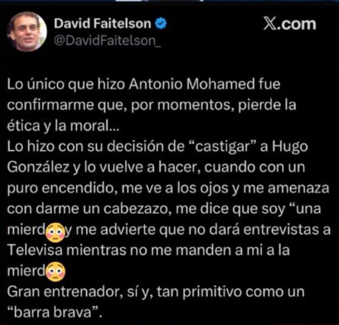 Luego del exabrupto por parte de Antonio ‘Turco’ Mohamed, David Faitelson le dedicó un posteo en su cuenta oficial de X.